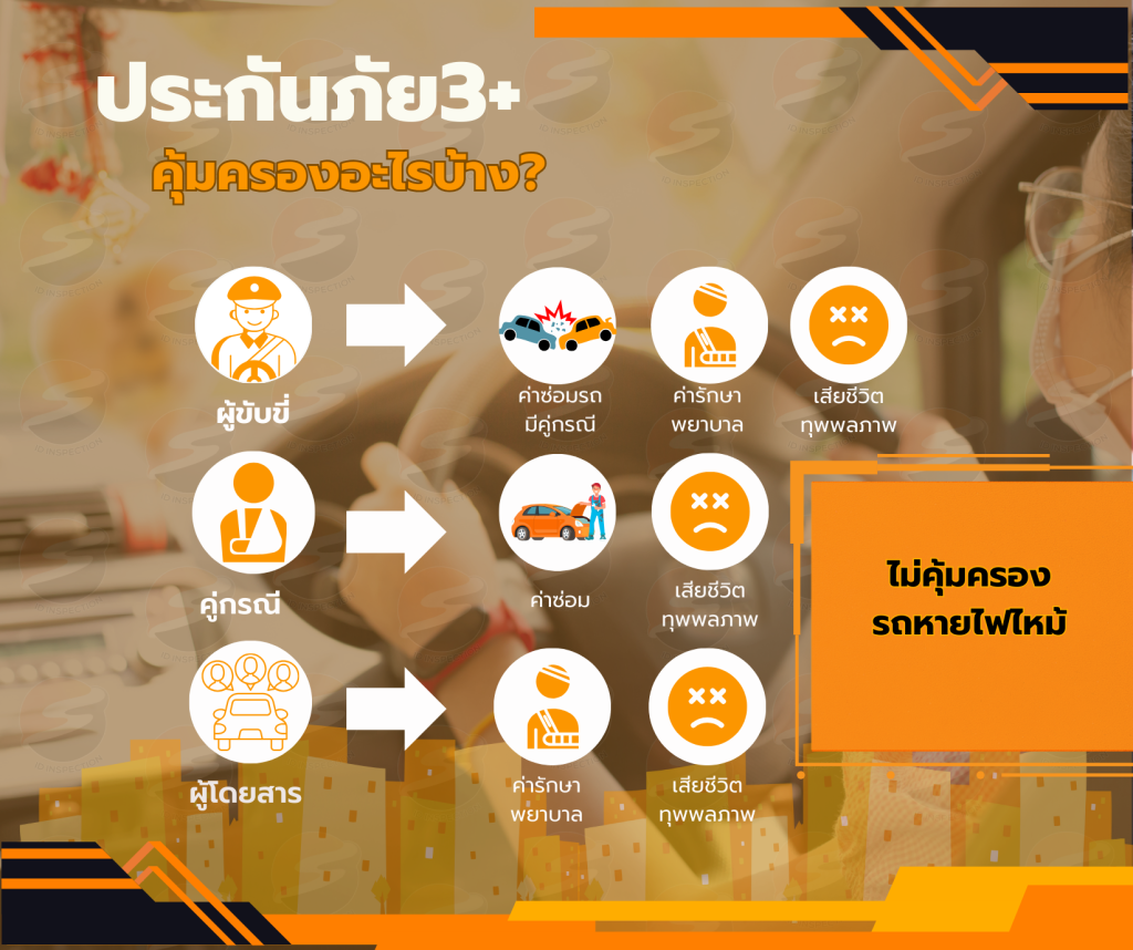ประกันชั้น 3+ เหมาะกับผู้ที่ต้องการความคุ้มครองขั้นพื้นฐาน แต่ยังอยากได้ความอุ่นใจเมื่อต้องใช้รถในเมือง โดยคุ้มครองดังนี้